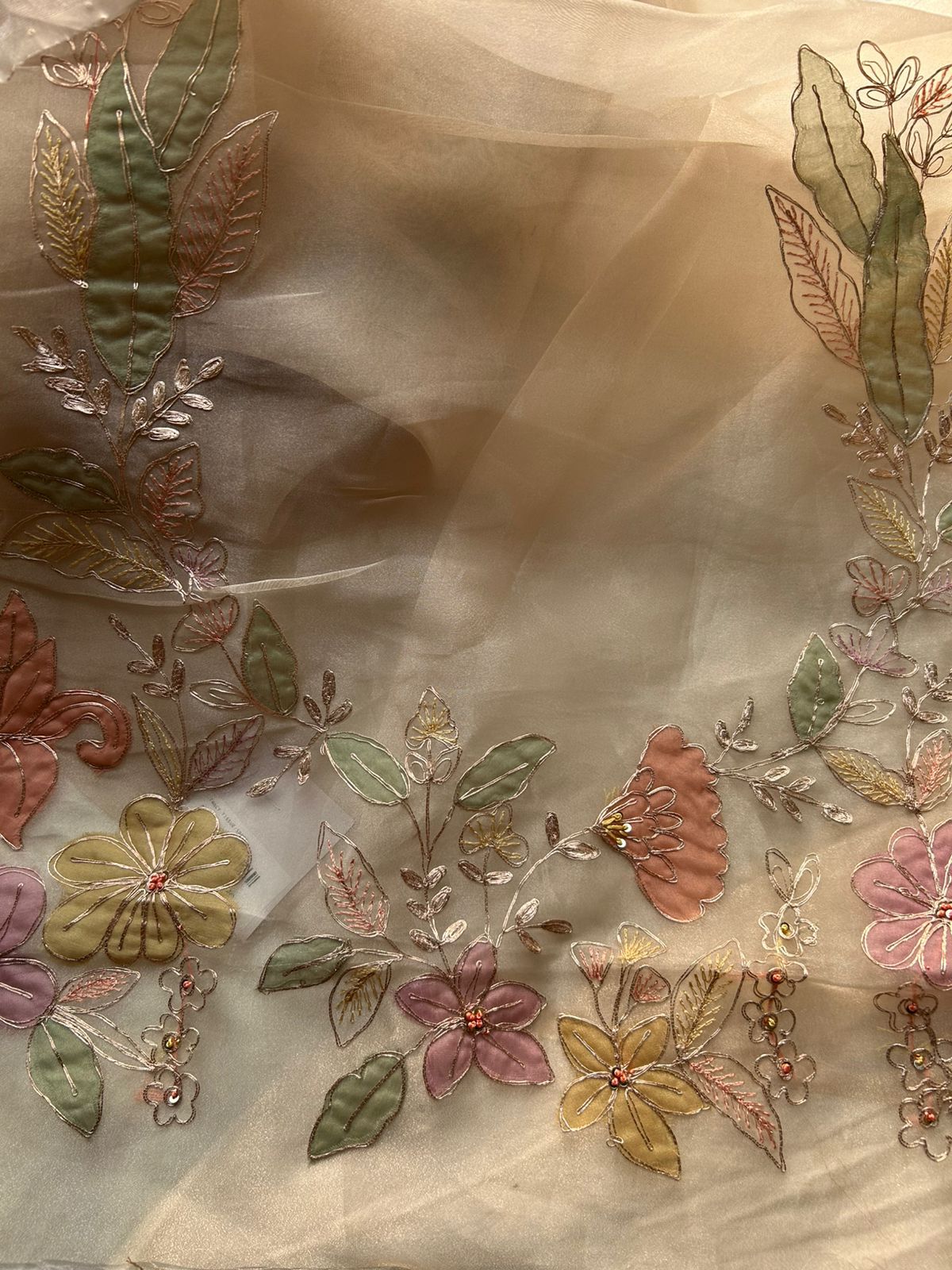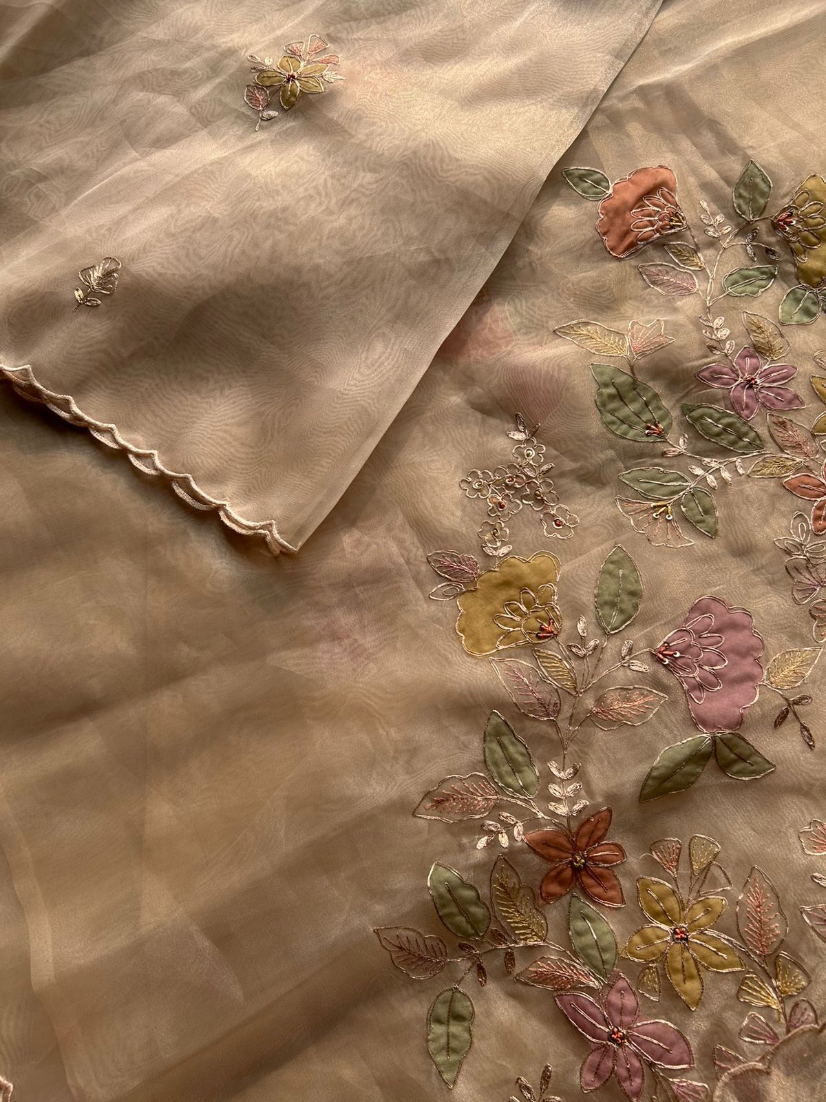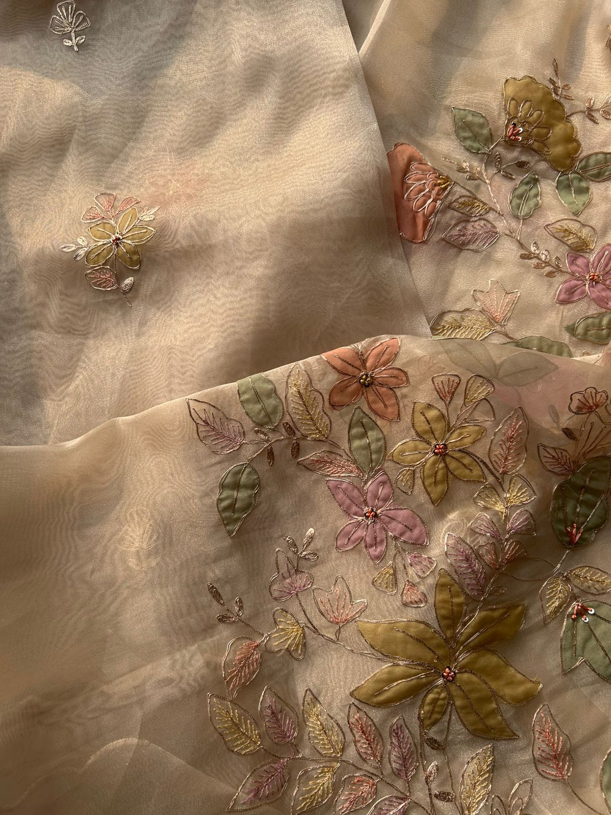 Crafted on premium glass tissue silk, the saree is beautifully enhanced with handcrafted appliqué pitta work that adds depth, artistry and subtle richness.
