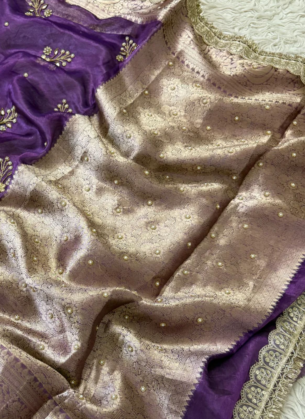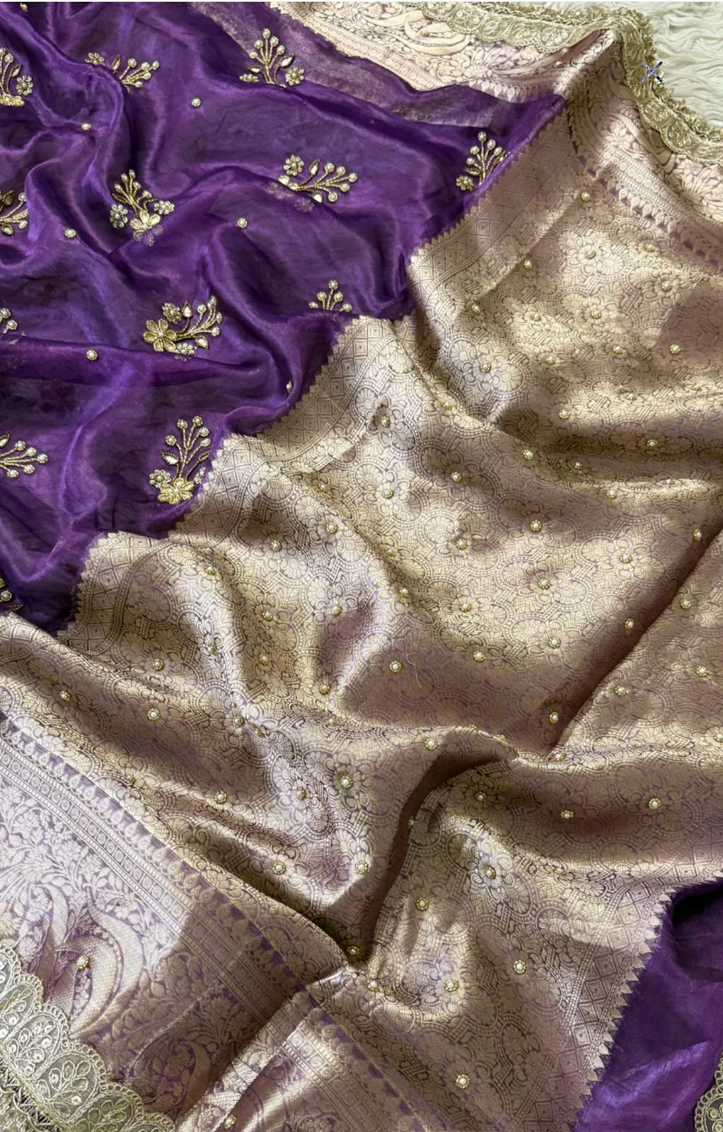 Lightweight yet richly luminous, this drape is perfect for weddings, festive occasions, and statement celebrations. Every fold speaks of patience, precision, and pure luxury.