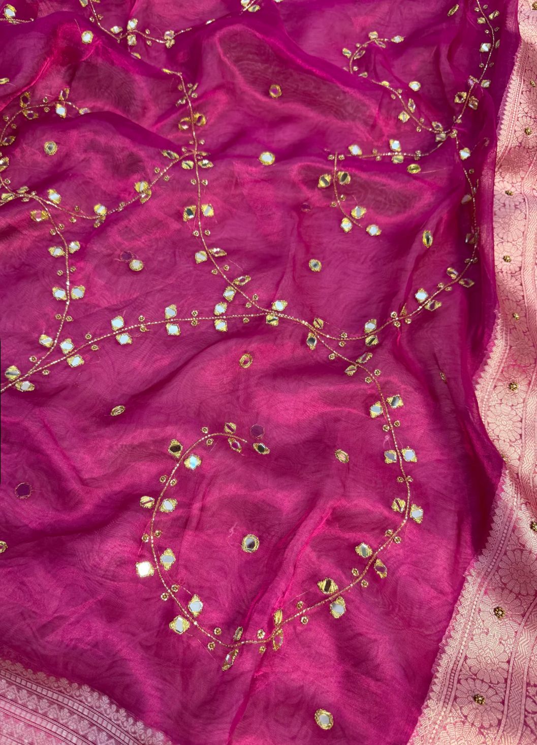 This exquisite saree is crafted in pure tissue silk, adorned with intricate hand-done glass jaal embroidery that reflects timeless elegance and fine craftsmanship. The delicate shimmer of tissue silk combined with the detailed jaal work creates a graceful drape with a luxurious presence.